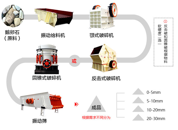 天然鵝卵石經(jīng)過料倉,由振動給料機進行均勻、連續(xù)喂料,送到顎式破碎機進行初級破碎,經(jīng)過初級破碎后的鵝卵石以及由振動給料機篩分的細小鵝卵石在皮帶輸送機的作用下被輸送到中轉(zhuǎn)料堆。
