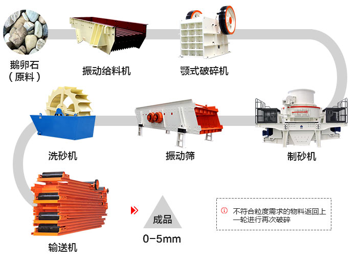大塊的鵝卵石需要粗碎后才可以進入細碎機進行細碎,細碎粒度合適的鵝卵石被送入制砂機進行細碎加工,制砂后的鵝卵石由圓振篩進行篩分,較大粒級鵝卵石返送至制砂機再次破碎,符合需求的則由皮帶機送至儲料堆貯存制成鵝卵石砂子的物料被送入洗砂機清洗,清洗后,作為最終產(chǎn)品的一部分,由皮帶機傳送至儲料堆進行包裝